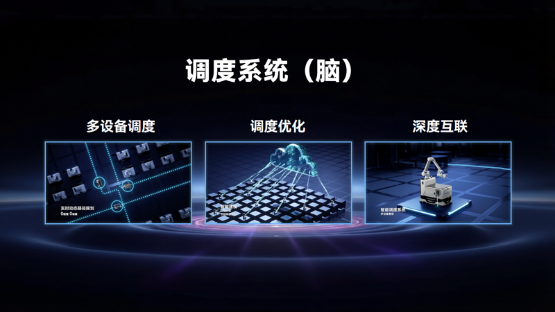 智能協同調度系統(腦): 作為“中央神經樞紐”,該調度系統支持多品類、多品牌設備接入,具備交通管制與流量優化能力,并能與MES、WMS、PLC等上層系統深度互聯。