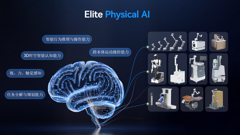 當前,許多具身智能平臺的演示聚焦于“能做什么”,但在真實工業中,價值的衡量標準是 “能把什么做到多好、多穩” 。艾利特機器人憑借對工業場景的深刻洞察與長期技術沉淀精準切入,自主研發 “Elite Physical AI” (簡稱:Elite PAI)工業級具身智能大模型平臺,走出了一條從底層重構、垂直深耕到規模化落地的獨特路徑,標志著工業機器人從依賴預設程序的僵硬執行,邁向了基于自主感知決策的根本性轉變。