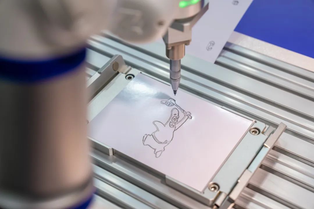 針對(duì)AI課程教學(xué)、人機(jī)互動(dòng)表演等教育行業(yè)場(chǎng)景,艾利特繪畫(huà)機(jī)器人搭配攝像頭及上位機(jī),可拍攝圖像并將其輪廓轉(zhuǎn)換為機(jī)器人軌跡數(shù)據(jù),通過(guò)SDK接口向機(jī)器人發(fā)送。機(jī)器人對(duì)接收到的軌跡數(shù)據(jù)進(jìn)行實(shí)時(shí)樣條插補(bǔ),解決上位機(jī)軌跡數(shù)據(jù)不連續(xù)、通信延遲不可控的問(wèn)題后,平穩(wěn)柔順地完成繪畫(huà)動(dòng)作。