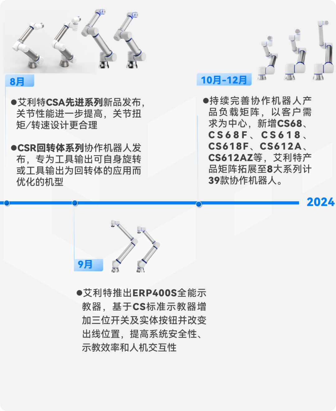 2023年,艾利特機器人在技術上全力進階前行,針對應用持續拓展產品矩陣,推出6大全新系列協作機器人,讓艾利特產品矩陣拓展至8大系列:穩定可靠的EC系列,性能卓越的CS系列,自研六維力傳感器的CSF系列,高精高速的CSA先進系列,碼垛專家CSH地平線系列,不懼高危環境的CS防爆系列,以及為打磨、螺絲鎖付、焊接、切割等而生的CSR回轉體系列,售價親民的EA系列。