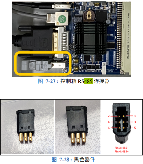 艾利特機器人EC系列支持RS485通訊,用戶可以通過將 RS485 設備連接到圖 7-27 中所示的連接器來從控制柜執行串行通信。為了能在控制柜中設置 RS485 連接器,必須拆掉串口連接 器,并將 RS485 線焊接到黑色連接器背面的金屬觸點,如圖 7-28 所示。黑色塑料裝置的正反 面分別標有 PIN“1 3 5”和“2 4 6”。PIN3 應焊接到 RS485B,PIN4 應焊接 到 RS485A。該 接口支持的最大波特率為 500Kbps。